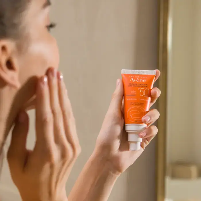 Au coeur de la Crème teintée SPF 50+, crème solaire teintée, l’association exclusive Sunsitive® protection, issue de la Recherche Pierre Fabre et composée :