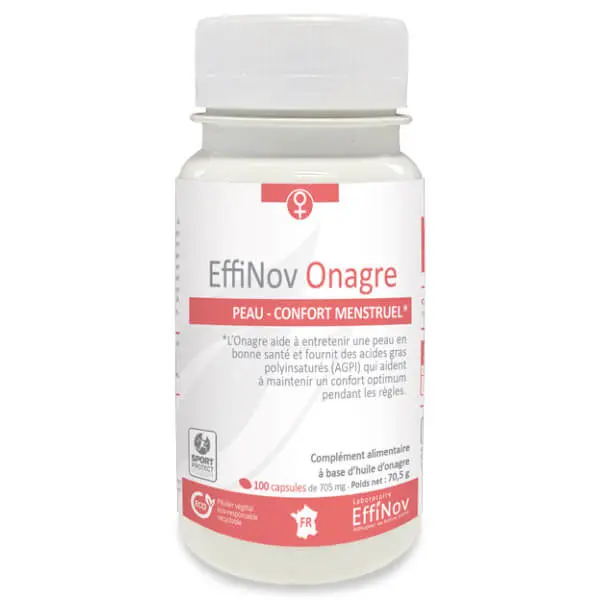 EffiNov Onagre est un complément alimentaire riche en huile d’onagre vierge qui aide à entretenir une peau en bonne santé, une croissance normale des cheveux, et fournit des acides gras polyinsaturés qui aident à maintenir un confort optimum pendant les règles