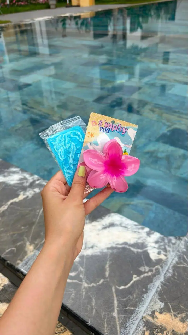 un foulard imprimé, une pince à cheveux, et un porte-téléphone en silicone.