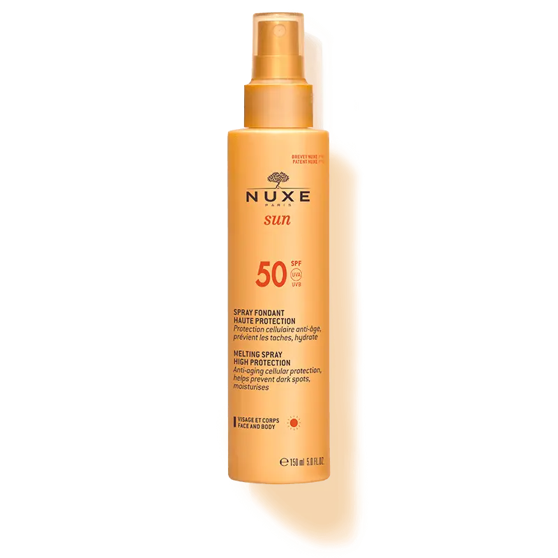 Spray fondant haute protection SPF50 de Nuxe Sun , une haute protection solaire pour le visage et pour le corps à la texture fluide.