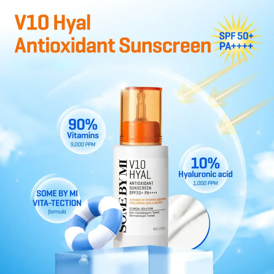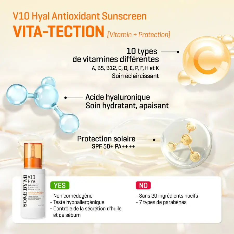 La crème solaire antioxydante SOME BY MI V10 HYAL SPF50+ PA++++ est une crème solaire très efficace avec un soin éclaircissant et anti-imperfections pour les peaux sensibles, qui la protège de manière fiable contre les rayons UV nocifs et en même temps la soigne avec de précieux antioxydants, des vitamines et de l’acide hyaluronique.